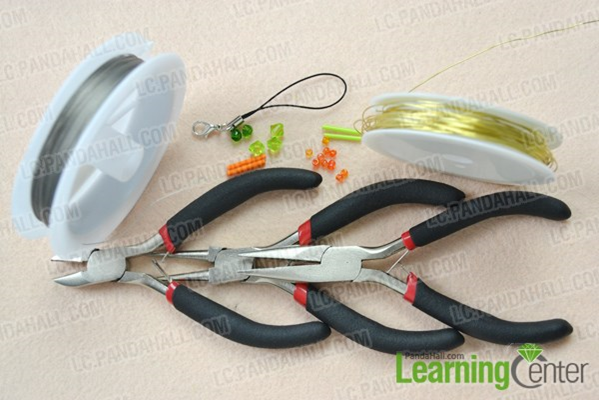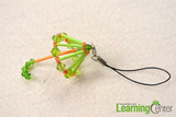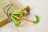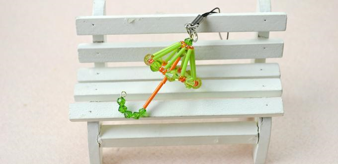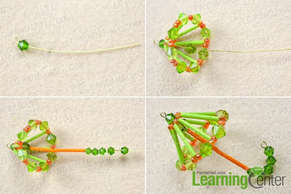 1. Взять около 15 см медной проволоки 0,5 мм, сделать петлю на одном конце. Нанизать 4 мм стеклянную бусину, продеть медный провод через верхнюю часть окружности бисерного зонтика, добавить 6 мм стеклянную бусину на проволоку, затем добавить два оранжевых стекляруса и пять 4мм стеклянных зеленых бусин.
