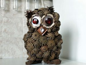 Очень интересным решением для поделки является сова из сосновых шишек. Она может отлично украсить интерьер, а ее изготовление позволит приятно и с пользой провести время. Если же таких совушек несколько и они будут сделаны из разных материалов, то это порадует вдвойне!