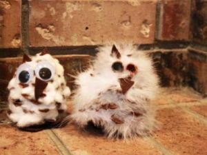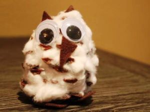 Ушки и лапки можно сделать из картона или палочек, закрепив их клеем в нужных местах. Совушку, которая изготовлена с помощью ваты, хорошо декорировать блестками.