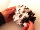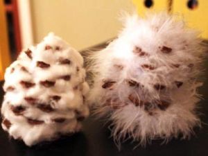 Вату нужно разделить на небольшие кусочки. Это будет своеобразное оперение для нашей совушки. Затем берем кисточку с клеем и промазываем шишечку внутри чешуек. После вату плотно прижимаем к местам, обработанным клеем, таким образом заполняя пустые пространства между чешуйками.