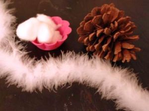 В случае, если у нас есть отдельные перышки, мы наносим на внутренние стороны чешуек шишки клей и просто аккуратно приклеиваем их. Если в наличии уже готовый боа, то оборачиваем шишку перьевым шарфиком и закрепляем его у основания.