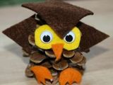 Прикрепив к шишке кусочки фетра, сделав головку и грудку из кусочков ваты и вырезав из картона очки, у нас получится совенок-профессор. На него также можно одеть и шляпку, выполненную из картонной бумаги.