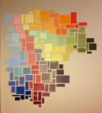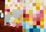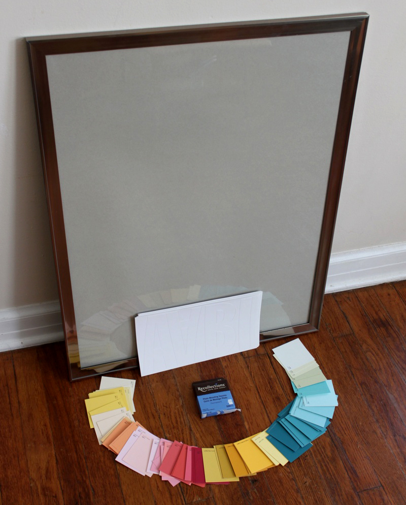 3. Начните с верхнего правого угла, прикрепите двухстороннюю ленту в каждом углу и прикрепляйте образцы краски. Сделайте первую линию сверху, а затем используйте ее в качестве руководства для выстраивания остальных. При добавлении второго ряда перекрывайте предыдущий ряд, так чтобы названия каждого цвета были закрыты.