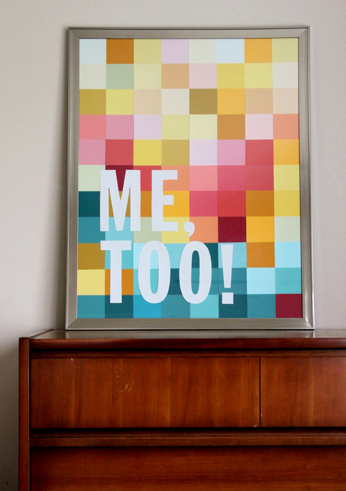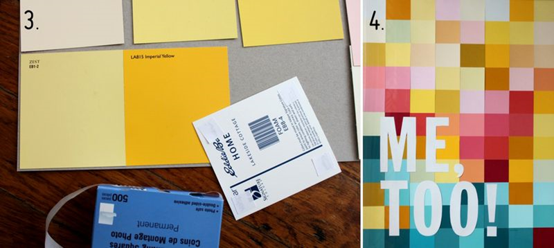 4. Придумайте фразу и вырежьте ваши виниловые буквы, расположите для начала, чтобы посмотреть, как вам нравится. Затем, используя двухстороннюю ленту, прикрепите их к фону из образцов краски. После этого, вы счастливы, что вы сделали это.
