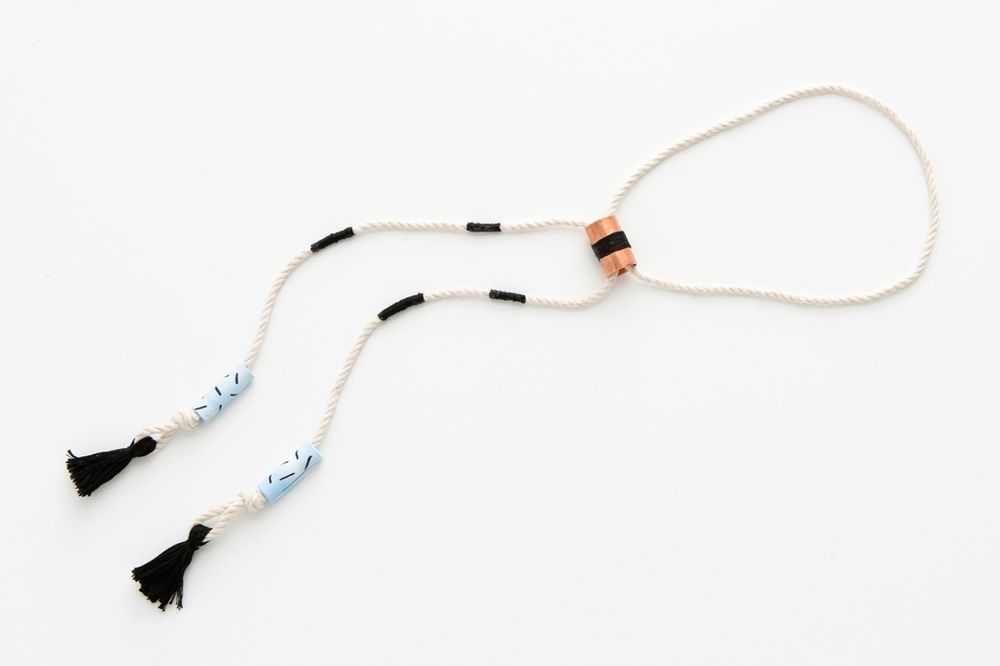 Добавьте детали из ниток вашей медной трубке как (смотрите здесь). Вырежьте кусок веревки нужной длины (ориентировочно около 60 см), и завяжите на одном конце веревки простой узел. Оденьте глиняные бусины на веревку и свяжите узел на другом конце веревки.