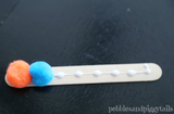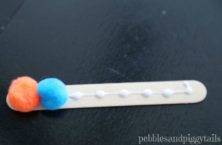 3. Для гусеницы: Просто точечно нанесите клей по всей длине палочки и приклейте помпоны, как показано на рисунке. На первый помпон приклейте глазки. Эта гусеница такая яркая и ее так легко сделать!