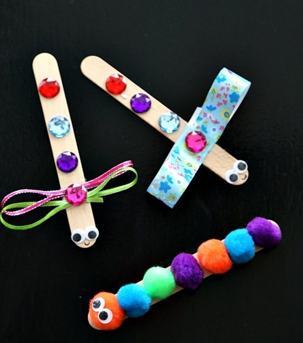 Отличная идея как занять малышей. Супер простой проект. Дети любят полакомиться мороженным, и также им нравятся и стрекозы и разные букашки. Можете объединить эти два занятия вместе и полакомиться, и заняться творчеством, чтобы из палочек для мороженного смастерить стрекозу, гусеницу или да мало чего вы придумаете! Подключайте свое воображение и фантазируйте!