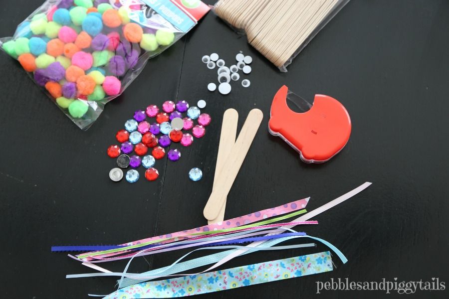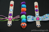 2. После того, добавьте несколько капель клея вдоль всей палочки и приклейте пуговицы, или стразы. Глаза можете либо нарисовать, либо приклеить готовые. По желанию ваш ребенок может стрекозу разрисовать цветными маркерами.