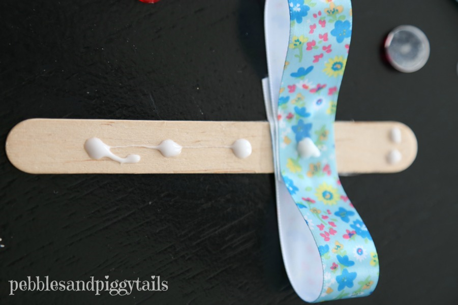 1. Для крыльев стрекозы: Сложите оба конца ленты в середину и приклейте клеем. Затем приклейте ее к палочке от мороженного, приблизительно на расстоянии 1/3 части от верха. Маленькие дети, могут нуждаться в вашей помощи на этом этапе.
