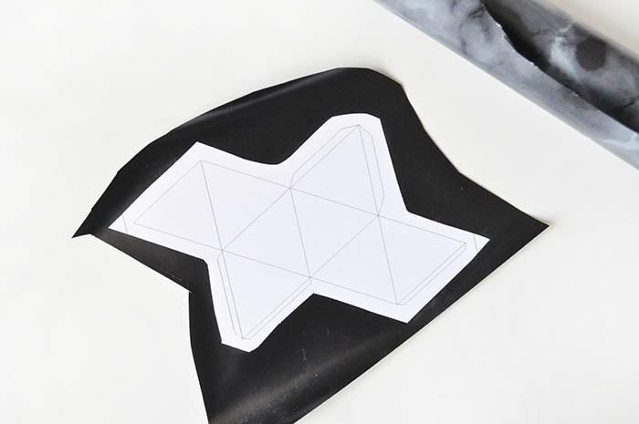 Возьмите самоклеющуюся бумагу, с «мраморным» узором, из которой вам нужно вырезать заготовку. Она должна быть большего размера, чем шаблон. Приклейте его к обратной стороне заготовки.