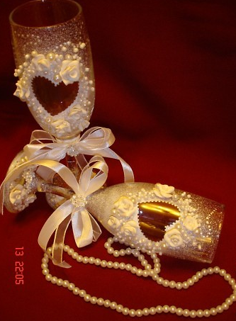 Тот же процесс повторяем на бокале. Наконец-то можно приступить к жемчужинам. Чтоб получить точный результат, клей лучше наносить на сами бокалы. Для удобства стоит приклеивать начиная с самых больших жемчужин.