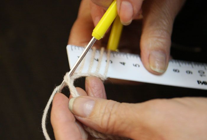 Вытягивайте длинные петли крючком, начиная с последней, и накидывайте на линейку.