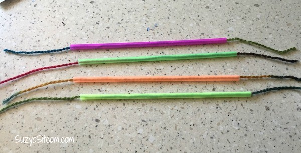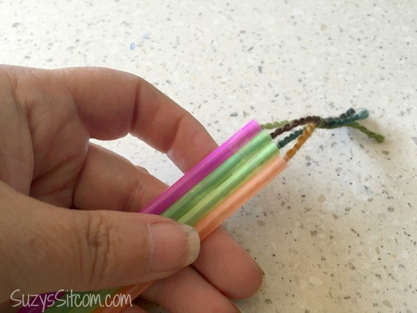 Теперь, когда задача ясна, вы можете попить чаек, а дети займутся творчеством. Продолжайте плетение до тех пор, пока не дошли почти до конца соломинки. Обрежьте нить, а затем завяжите конец нити к трубочке, точно также как в начале плетения.