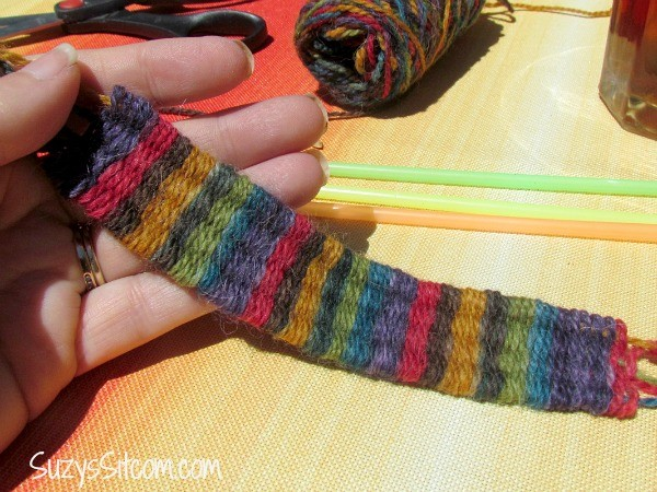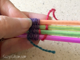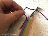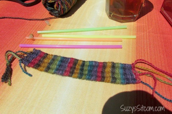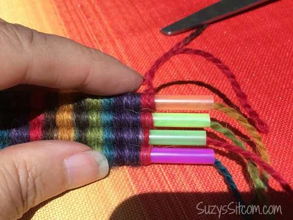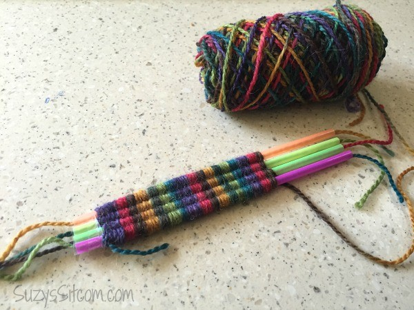 Теперь можете начинать плести! Возьмите пряжу и заводите над и под соломинку. Например, начиная с розовой трубочки, пропустите нить под синюю, над зеленой, под оранжевую. Затем двигайтесь назад в другом направление- над оранжевой, под зеленой, над синей, под розовой. Когда вы обплетаете трубочки, прибивайте каждый ряд к предыдущему.