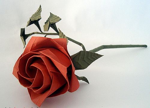 В замотанную нитями часть бутона втыкается зубочистка, которая обматывается зеленой бумагой и флористической лентой (для придания бутону большей крепости). Заключительная стадия - образование чашелистиков, для которых потребуется вырезать еще одну квадратную заготовку, нарезая с одной стороны зубцы (необходимо учесть расход пяти зубцов на каждый чашелистик). Краешки чашелистиков подкрутить, покатав их между пальцами, разместить их на стебле и наслаждаться собственным произведением.
