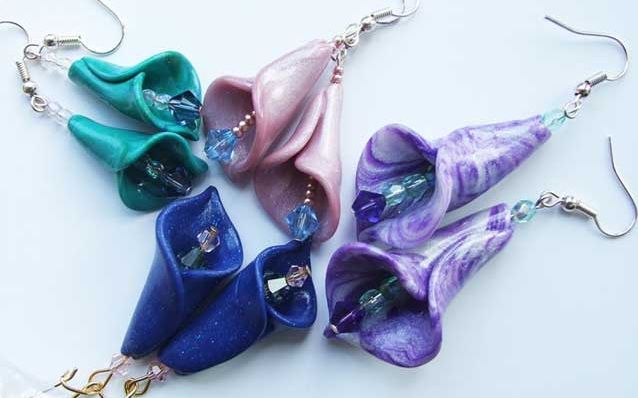 Сделать каллы из полимерной глины будет не очень сложно, и на их изготовление уйдет не очень много времени. В конкретном случае, для украшения цветка использовали бусины, а сам цветок прикреплен к крючку. В итоге получились простые, но очень очаровательные серьги.