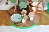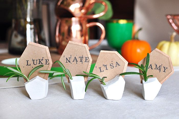 Застелите поверхность пергаментной бумагой. Разделите глину на небольшие кусочки, примерно размером как мячики для пинг-понга. Сформируйте руками ассиметричные геометрические фигуры (тут по желанию. Хотите строгие кубики - лепите кубики. Или сферы с устойчивой подошвой). Чуть влажной губкой сгладьте возможные трещинки и следы от пальцев. Пока материал еще влажный - сделайте слот для карточек. Используйте металлический шпатель или пластиковую карту. Если ничего похожего нет - просто продавите щель тем же картоном, из которого мы будем делать карточки. Зубочисткой можно сделать круглое отверстие для мини-свечек, бенгальских огней или веточки цветка.После высыхания возможно появление новых трещин, замажьте их свежим слоем глины.После высыхания второго слоя глины, сделайте быструю шлифовку специальной губкой.Осталось вырезать именные карточки, заполнить их именами и распределить по держателям. Для красоты можно добавить в круглые отверстия веточки розмарина - они придадут свежий цвет и тонкий аромат. Источник фото: http://www.designsponge.com