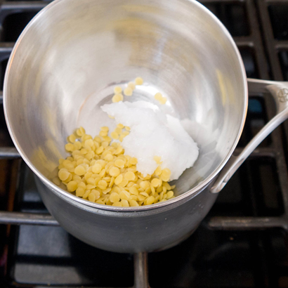1.Для того, чтобы приготовить удивительный бальзам, поставьте небольшую кастрюлю, заполненную наполовину с водой на средний огонь. Теперь измерьте и добавьте пчелиный воск и кокосовое масло в небольшую миску и поместите ее на водяную баню (в кастрюлю с разогретой водой) и помешивайте, пока смесь не растает.