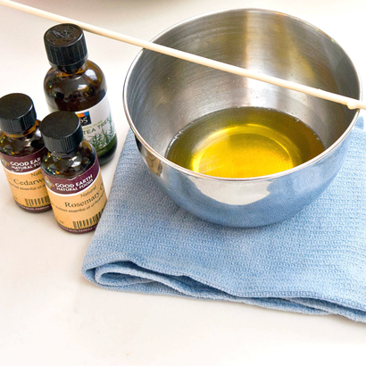 2.Осторожно снимите миску с огня, и поместите поверх сложенного кухонного полотенца. Это поможет удержать миску на месте и защитит вашу столешницу. Для того, чтобы улучшить качество бальзама, добавьте смесь эфирных масел, большинство из которых являются также антибактериальным и противогрибковыми. Мы использовали комбинацию эфирных масел чайного дерева, кедра и розмарина. Аккуратно перемешайте ложкой или деревянной палочкой, которую вы можете выбросить, когда закончите.