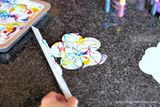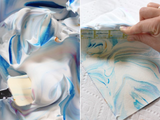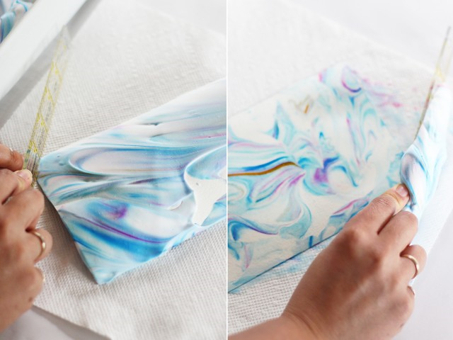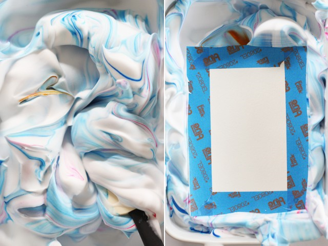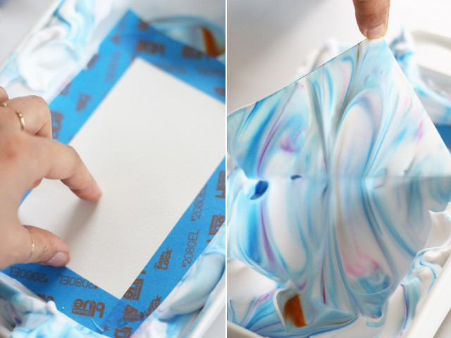 Ваш рисунок не должен быть совершенным. Он будет делать всю эту мраморную магию самостоятельно. Поместите бумагу на крем для бритья, так, чтобы сторона с наклеенной малярной лентой была сверху.
