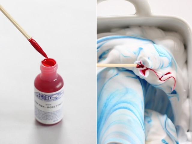 После того, как ваш основной цвет готов, вы можете добавить дополнительные цвета зубочисткой или деревянной шпажкой. Просто добавьте пищевой краситель в разные места и смешайте слегка круговыми движениями.