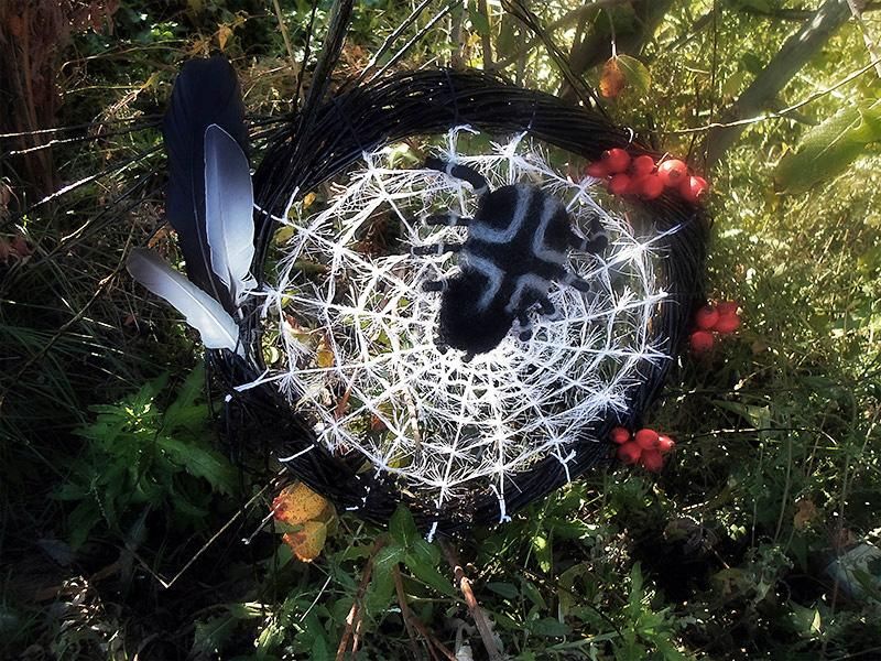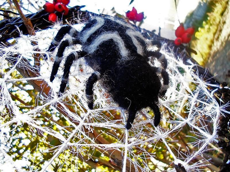 обматываем серой шерстью каждую лапку и выбиваем контур креста на спине. Красиво загибаем ножки нашему пауку и сажаем на паутину, никакого дополнительного крепления ему не нужно.
