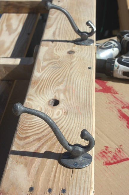 Прикрепите крючки к передней части полки шурупами. Покрасьте полку. Если вы не будете красить крючки, сначала покрасьте полку подождите пока высохнет.