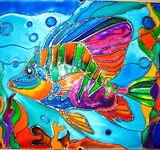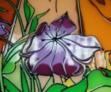 - Начинаем роспись непосредственно витражными красками. Их можно и нужно смешивать на палитре, подбирая требуемый оттенок. При выполнении витражной росписи по стеклу очень важно следить за тем, чтобы не допускать высыхания отдельных участков. При повторном накладывании краски они могут потрескаться, дать так называемый эффект кракелюра. Кроме того, очень грубо и некрасиво будут смотреться зоны переходов.