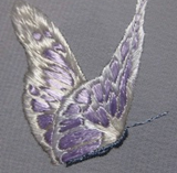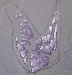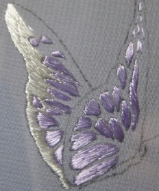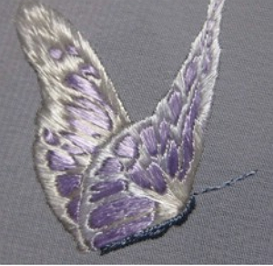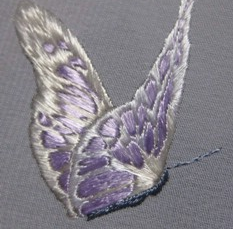 Потом следует заняться дальним крылышком. Важно использовать нитки оттенка потемнее для задних крылышек, чтобы показать перспективу.