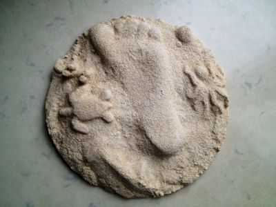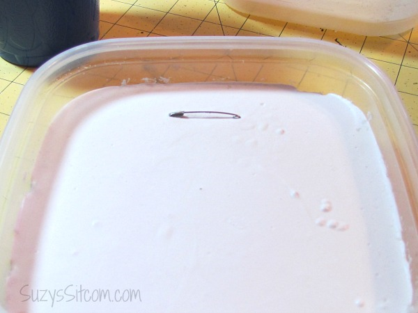 Вылейте эту смесь в контейнер над песчаной формой и, прежде чем она начнет затвердевать, вставьте булавку в верхнюю часть формы (для подвешивания). Дайте высохнуть в течение приблизительно часа.