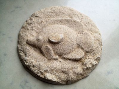 Затем удалите затвердевший гипс и используя большую кисть, почистите заготовку от сыпучего песка. Опустите готовый кусок не на долго в ведро с водой, чтобы очистить все остатки песка из щелей. (Не сливайте песок в раковину!)