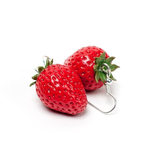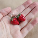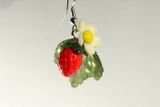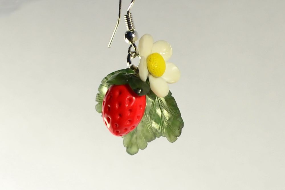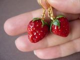 Закрепляем фурнитуру для сережек. Для этого в основание клубнички вводим штифт. Остается только запечь клубнички. Для этого еще раз прочитайте инструкцию, чтобы правильно выбрать подходящую температуру и время на запекание изделия из пластики. После того, как клубнички будут остужены, их можно покрыть лаком, а можно использовать и в таком виде.