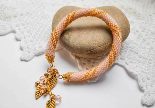 Далее начинаем фантазировать. Нужно выбрать концевики, которые подойдут по диаметру, застежку, и, понятно, украсить наш браслет. Декорировала я браслет подвеской с хрусталем розового цвета, бусинами из стекла золотистого окраса и акриловыми листиками золотистого цвета.