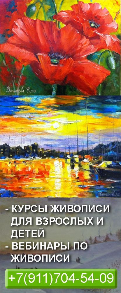 Дополнительная информация: все материалы входят в стоимость (краски, кисти, мольберт, холст 40*50 см, картинки выбираем из нашего альбома, свои картинки желательно предварительно согласовывать, иногда здесь тоже допускается море или обнаженная натура после согласования с преподавателем).