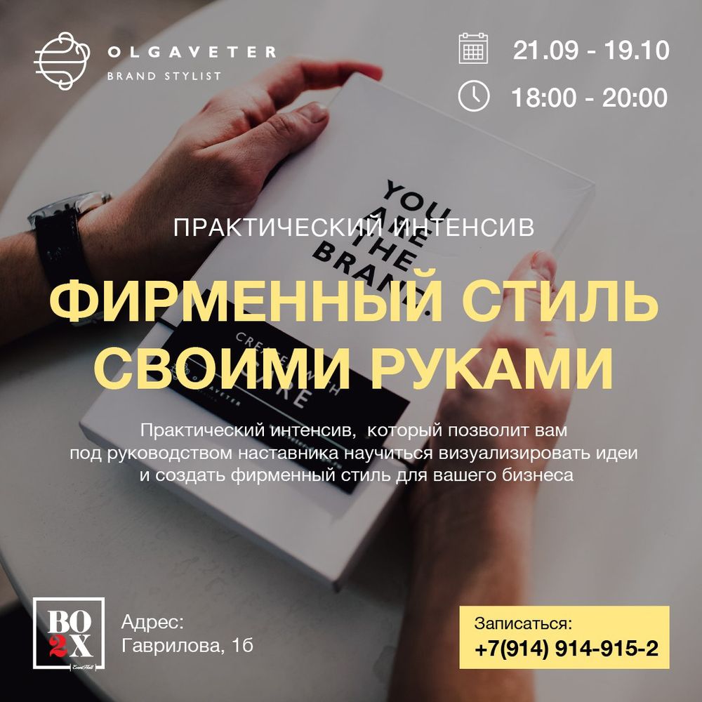 Всем привет! Меня зовут Ольга Ветер! Уже более 7-ми лет я помогаю новым брендам и торговым маркам в создании их уникального стиля. И сегодня я хочу пригласить вас на свой авторский интенсив «Фирменный стиль своими руками», который начнется 21 сентября в 12:00 в Box2 Event Hall.