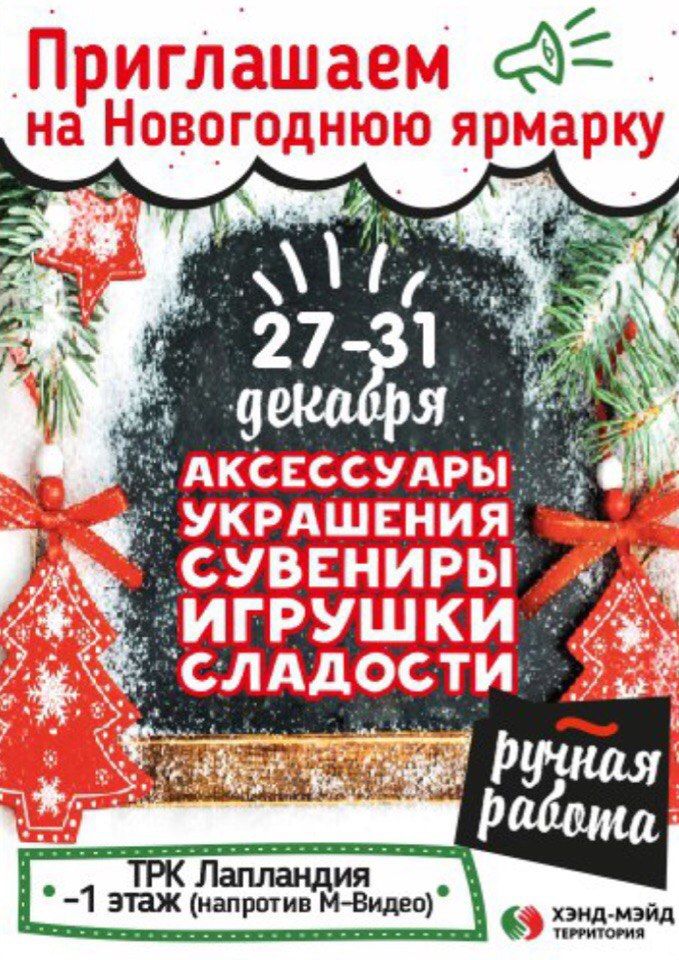 Приглашаем посетить нашу предновогоднюю Ярмарку изделий ручной работы! У нас вы найдете подарки на любой кошелек! Цены изделий от 50р. Если вы ищете подарок для истинных ценителей эксклюзива, то нам так же есть что Вам предложить!!!