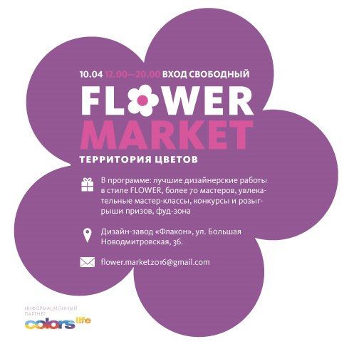 Приглашаем флористов и мастеров, создающих изделия в цветочной тематике: живые цветы и букеты, одежда и текстиль, цветочные чаи, свечи, косметика, украшения для интерьера, декупаж, цветочные топиарии, саше, посуда с цветочным принтом, картины и панно.