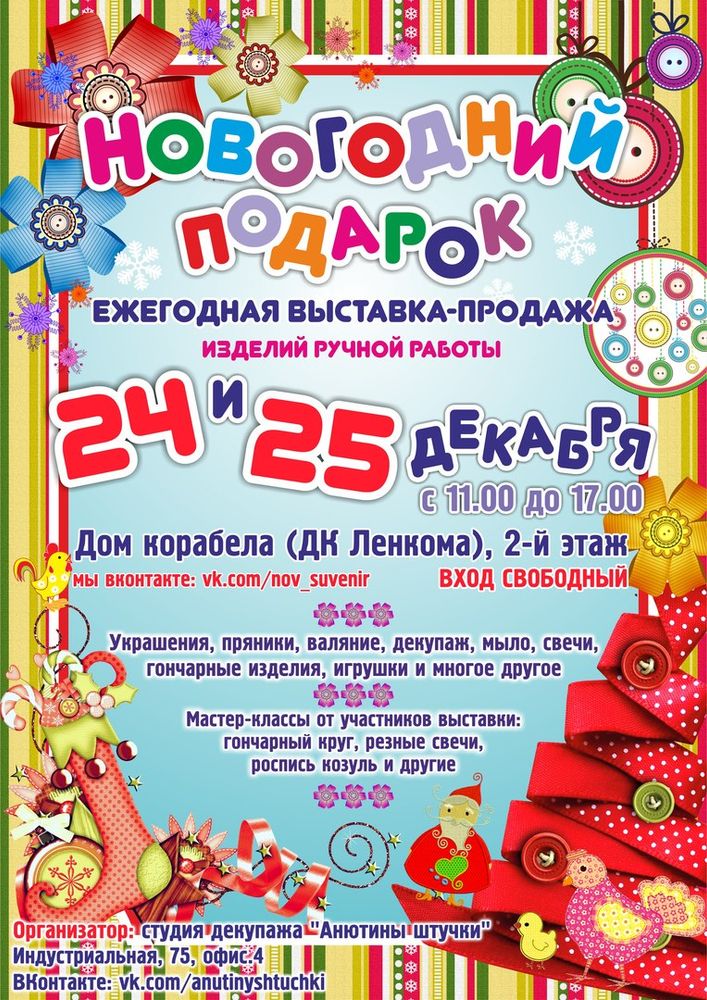 13.00 - Мастер-класс «Новогодняя открытка в технике скрапбукинг». Запись здесь: https://vk.com/topic-131507892_35058346