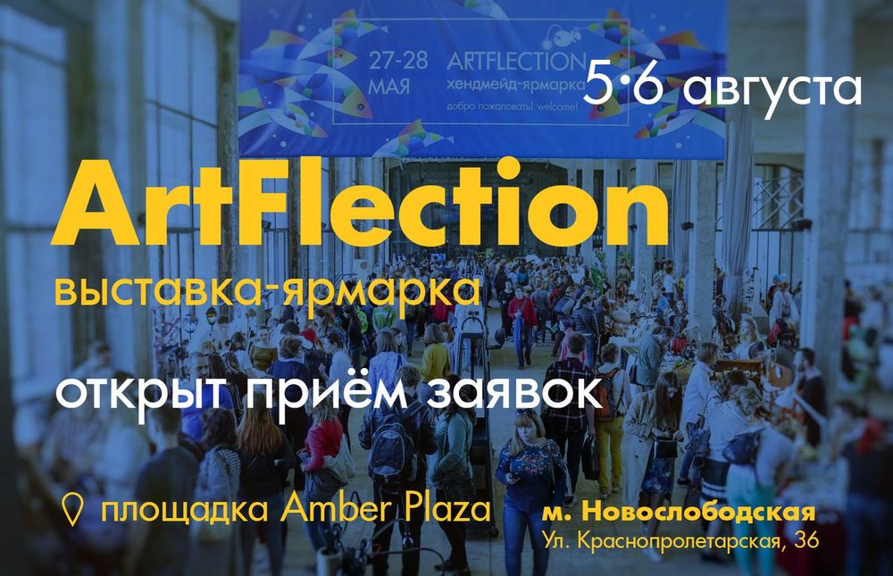 5 и 6 августа ArtFlection пройдет на площадке Amber Plaza. Новая программа, формат и имена. Мы наконец-то сможем реализовать давние идеи и очень надеемся вас удивить и порадовать этим летом. Вступайте в новую встречу ярмарки ArtFlection, чтобы узнавать о конкурсах, участниках, новостях и программе.