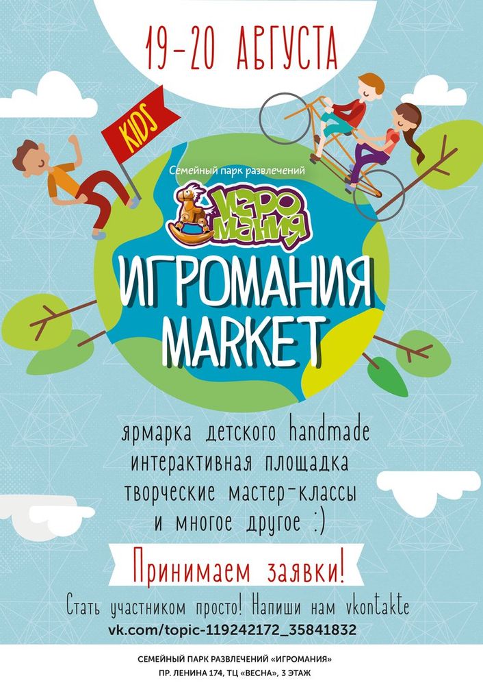 "Игромания MARKET. KIDS" - ярмарка детских поделок в нашем парке. Где можно приобрести уникальные изделия hand made. На нашей площадке ребятишки попробуют себя в роли юных бизнесменов, а родители и гости парка станут покупателями. На вырученные деньги дети смогут позволить себе осуществить те покупки, о которых они давно мечтали, либо провести весело время в нашем парке!