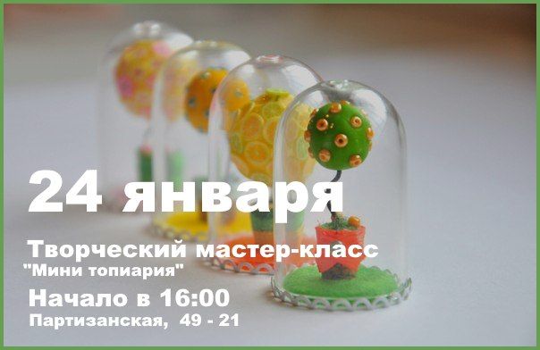 Специально для всех любителей необычных вещей, сделанных своими руками, мы проводим уникальный мастер-класс по созданию мини топиария. Вы наверняка слышали о таком виде творчества, но мы предлагаем сделать мини топиарий под куполом, высотой всего 4 см. Его можно использовать в качестве украшения интерьера или рабочего места, а также можно подвешивать. Яркий, сочный мини топиарий - это уникальное украшение или подарок близким. Творить будем в уютной атмосфере студии "Мастерская Творчества" за чашкой чая!