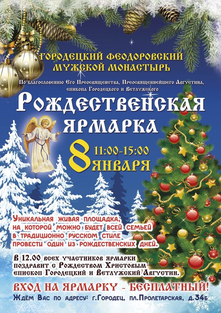 По благословению Его Преосвященства, Преосвященнейшего Августина, епикопа Городецкого и Ветлужского 8 января с 11.00 утра на территории самого древнего монастыря в Нижегородской области Городецкого Феодоровского мужского монастыря откроется традиционная «Рождественская Ярмарка».