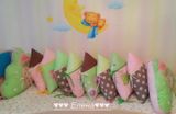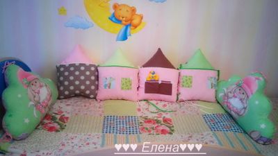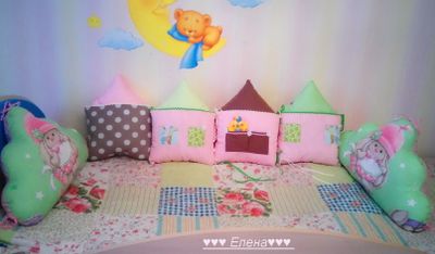 Бортики-домики в детскую кроватку изготовлены из хлопка , украшены тесьмой . Цена указана за 1 домик. Размер 30*40см