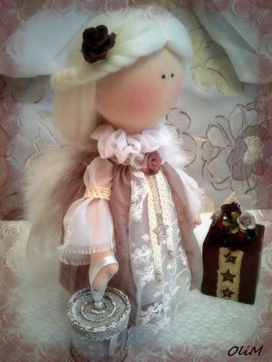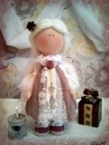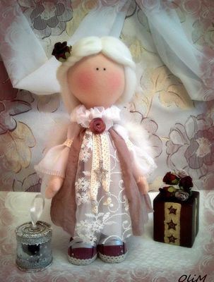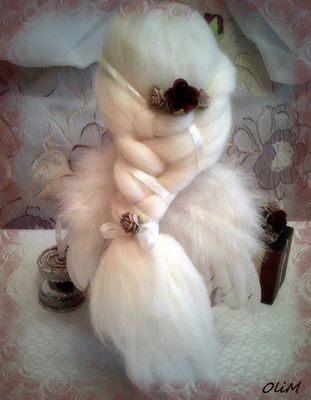 Рост 32см. Стоит и сидит сама, ручки и ножки подвижны. Одежда и обувь не снимается. Крылья отстегиваются. Материалы: кукольный трикотаж, жатый хлопок, хлопковое кружево, кружево, органза, искусственный жемчуг, стразы, атласная лента. Цветы бумажные. Волосы - шерсть 100%.