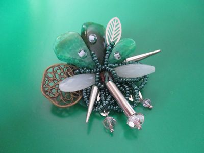 Очаровательная дизайнерская брошка с натуральными и искусственными камнями, оформлена чешским бисером, металлическими лепестками по бронзу и серебро, металлической фурнитурой под серебро. Смотрится как волшебный цветок, доставленный из эльфийского сада.