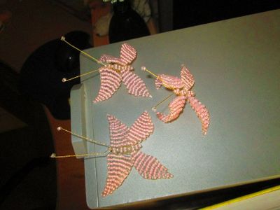 Небольшие бабочки из бисера. При дневном освещении розового цвета, в темноте светятся зеленым "фосфорным" цветом. В наличии.