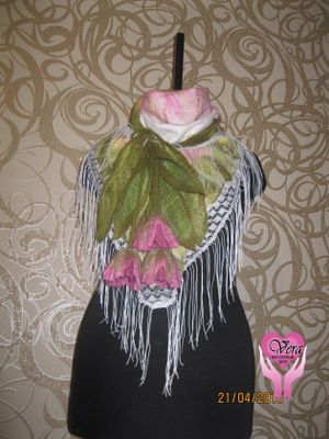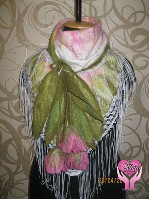 валяный бактус на основе каркаса из полиэстер-косынки. размер бактуса позволяет носить его как шарф, не зависимо от времени года, и так же как косынку в холодную и ветреную погоду. завязки-тюльпаны гармонично дополняют весенний образ