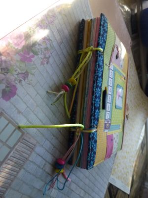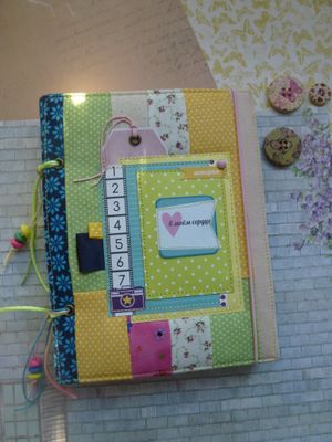 вот такой веселенький блокнотик в мягкой тканевой обложке,с разделителями,тегами и карточками для записей, подложками для фото,блок белых страничек формата А-5