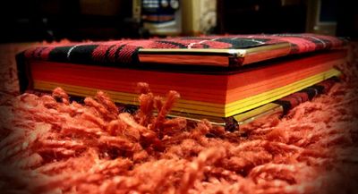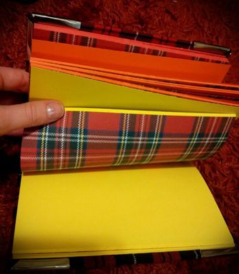 Красный мягкий клетчатый блокнот с металическими уголками и цветными страничками. Блокнот делится на три цвета – красный, оранжевый и желтый. Форзацы, множество разделителей и обложка выполнены с одинаковым принтом. Очень УЮТНЫЙ блокнот, немного меньше размера А5.