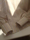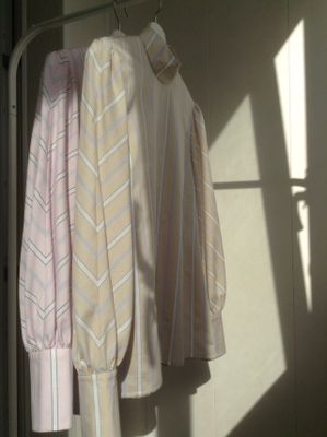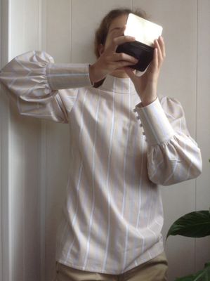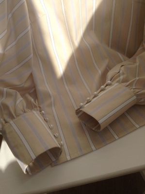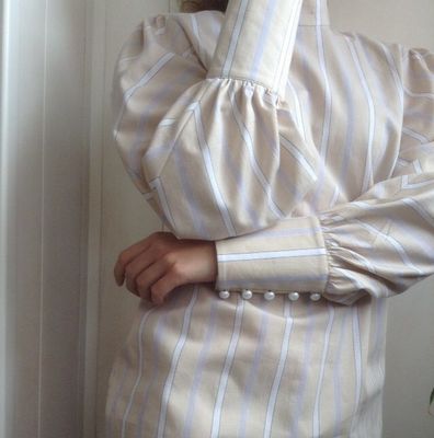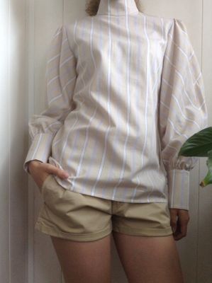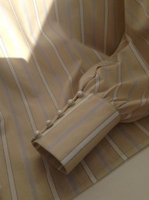 Блузка из нежно-бежевого хлопка в белую полоску. Пышные рукава со стыковкой по диагонали и небольшой воротник-стойка дань популярному сегодня викторианском стилю.